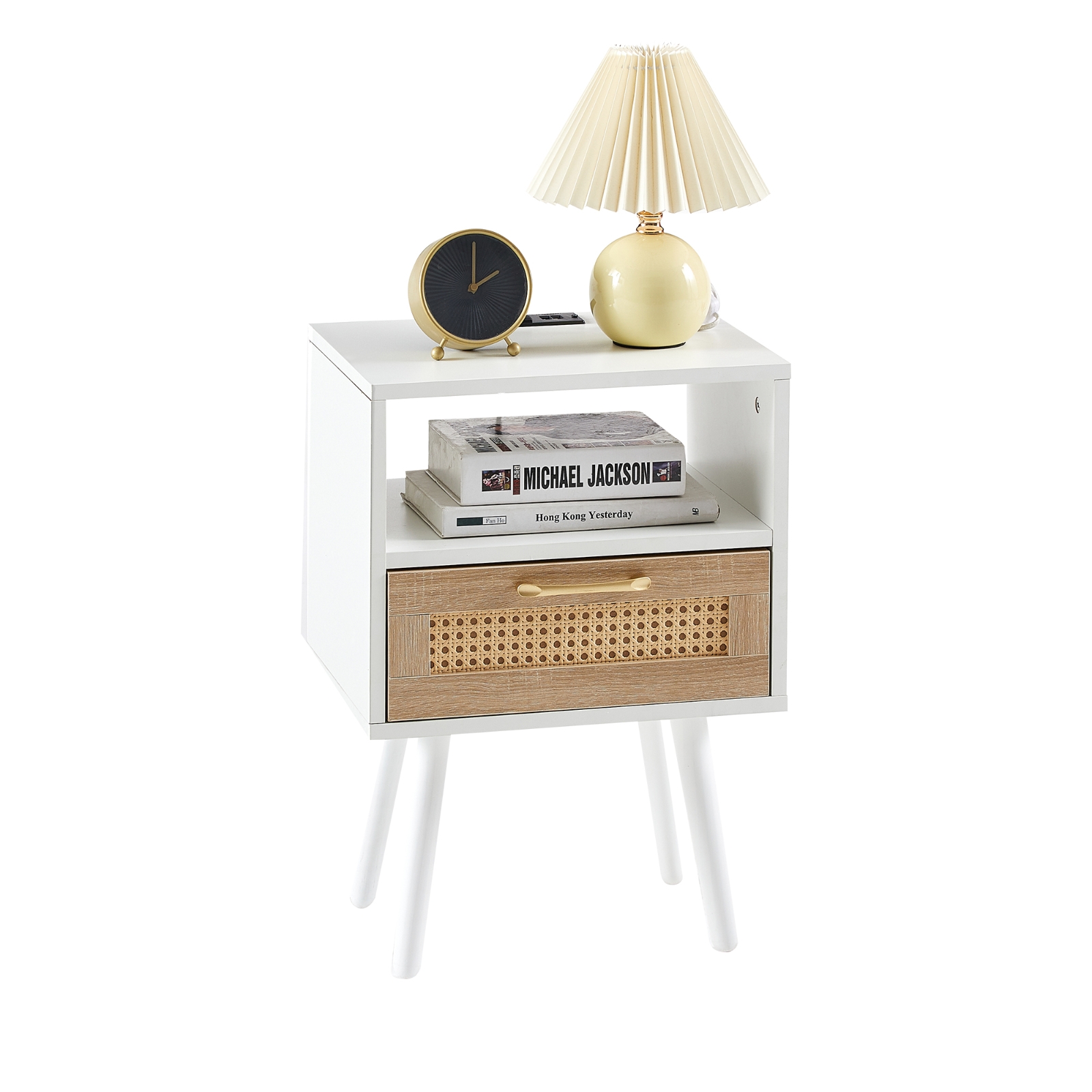 15.75\ Rattan End table with Power Outlet & USB Ports , Modern nightstand with drawer and solid wood legs, side table for living room, bedroom, white