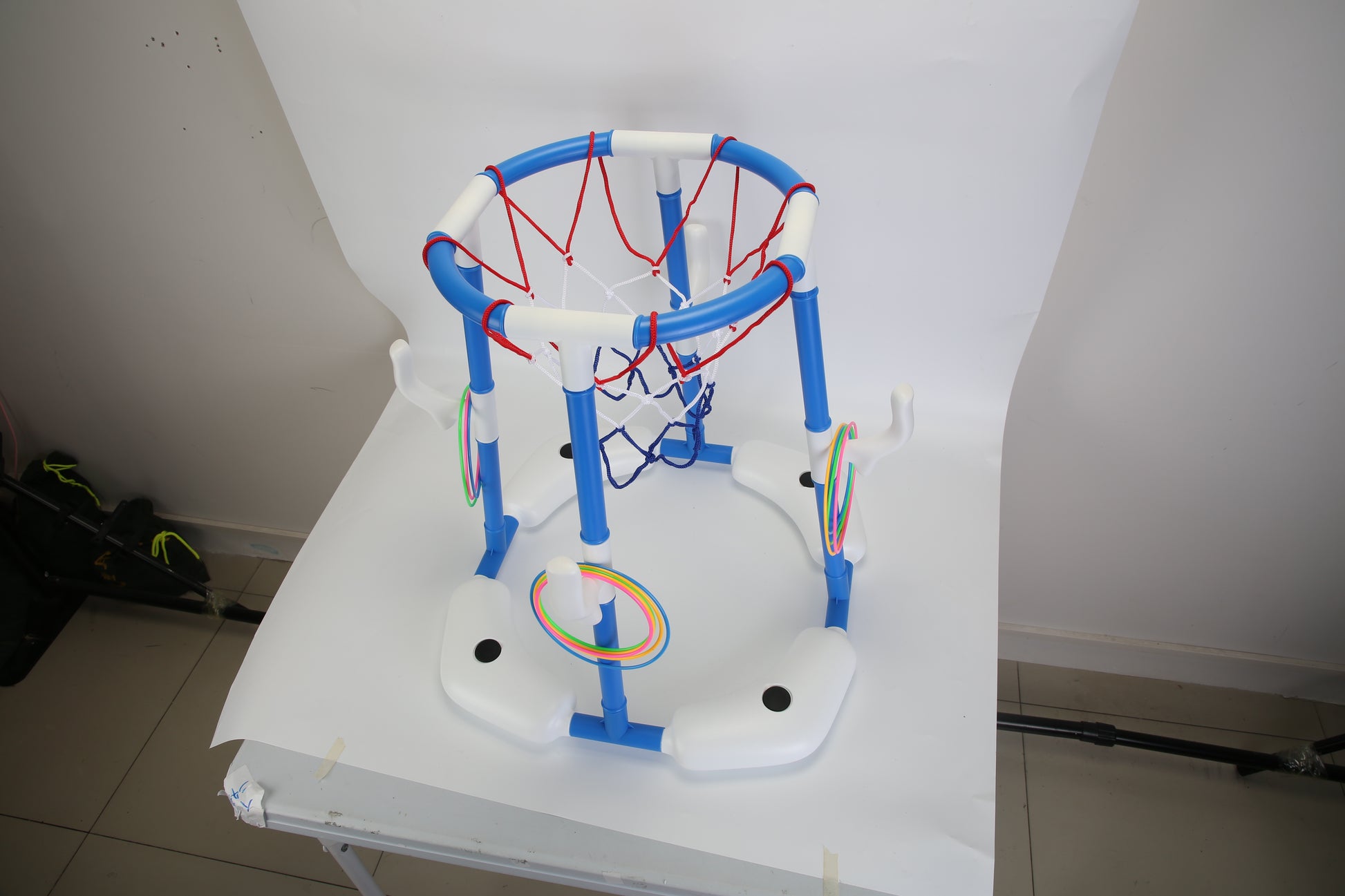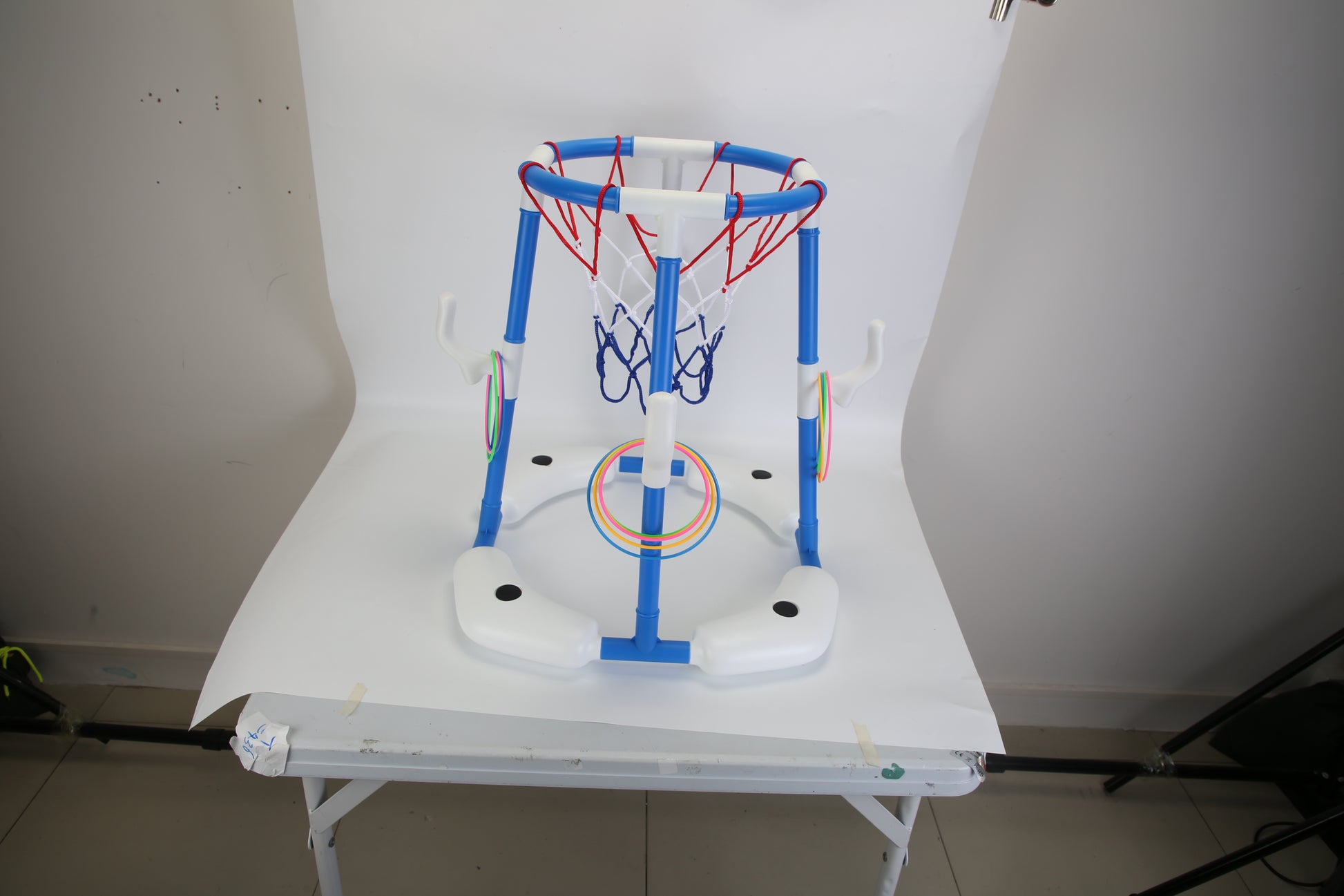 - *Pool Basketball Toy Set*: Our summer pool basketball hoop toy set includes a blue/red basketball hoop,4 balls,4 circles and a convenient pump,designed to bring endless excitement and enjoyment to you and your family. Whether you're organizing a themed pool party or just looking for ways to enjoy a sunny day,this set is an excellent addition to your summer activities.