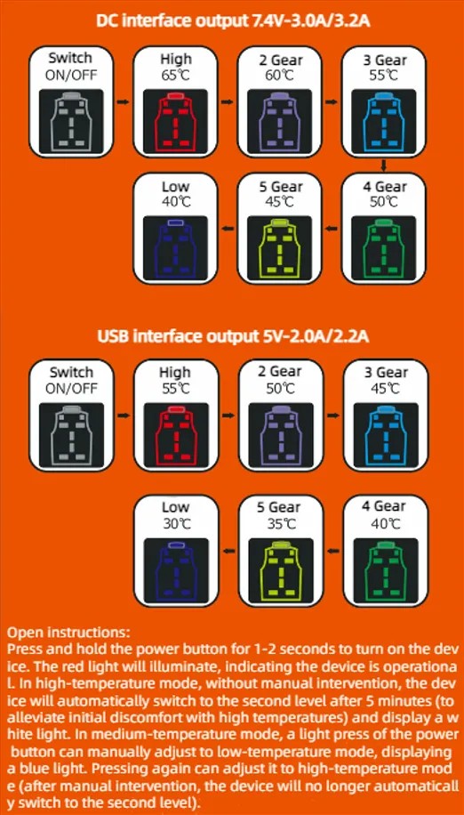- Press and Hold the Button : Press and hold the power button on the vest for about 2-3 seconds until the light turns on, indicating the heating function is activated.