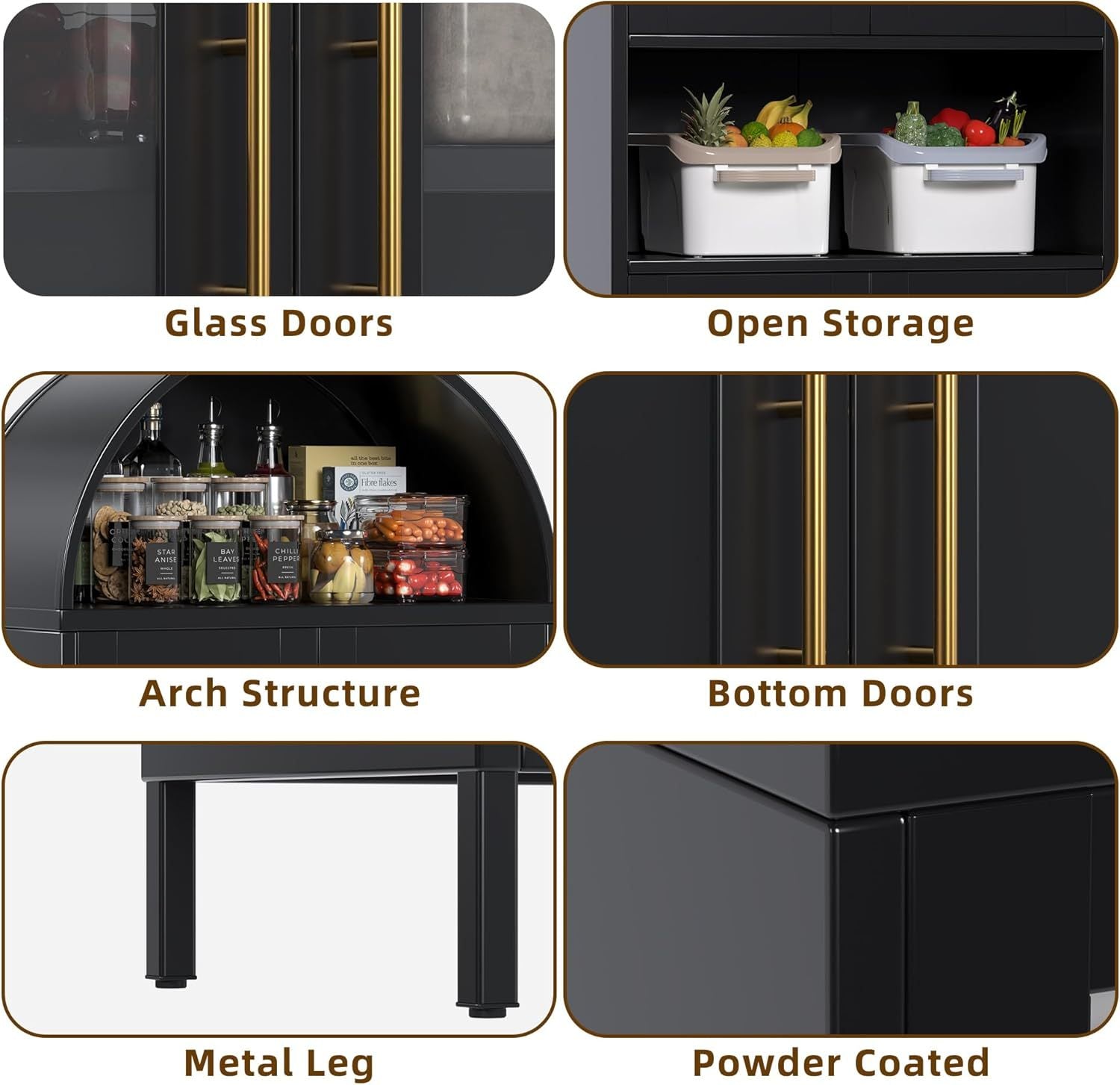 73 In Tall Metal Arched Cabinet, Kitchen Pantry Cabinet With Glass Door, Modern Farmhouse Arched Bookcase With 2 Adjustable Shelves For Living Room, Black, Assembly Required