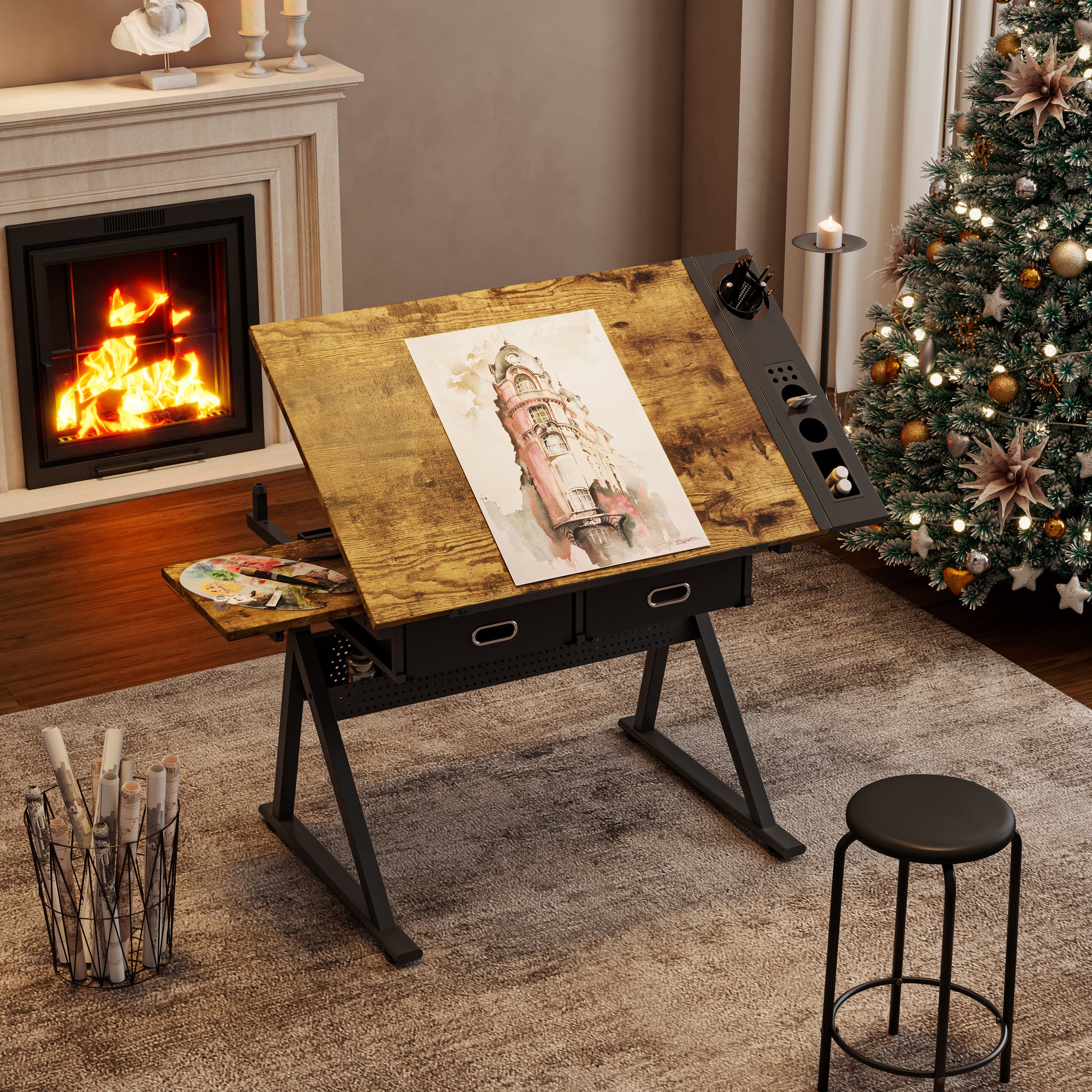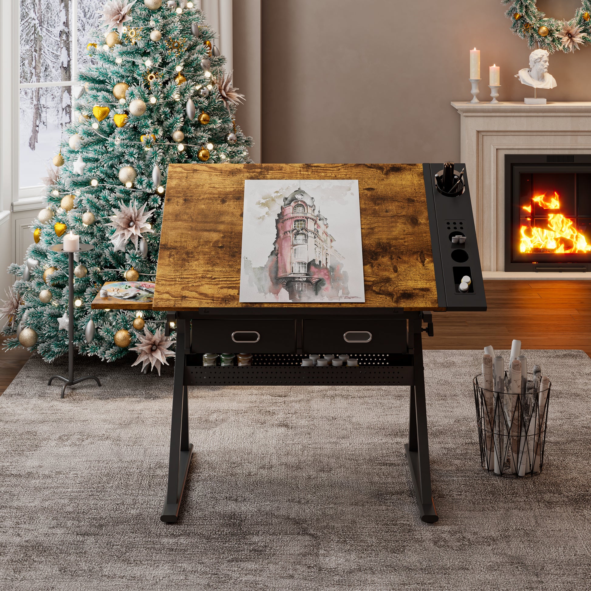 Adjustable Drawing Drafting Table Desk With 2 Drawers For Home Office And School With Stool Wood