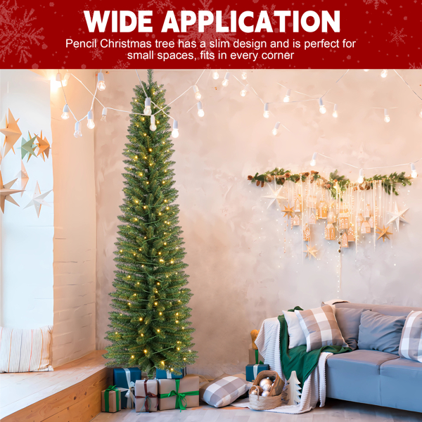 Artificial 6ft Green Pencil Christmas Tree With 358 PVC Branch Tips, 150L Warm White Led, Foldable Base For Indoor Holiday Decorating