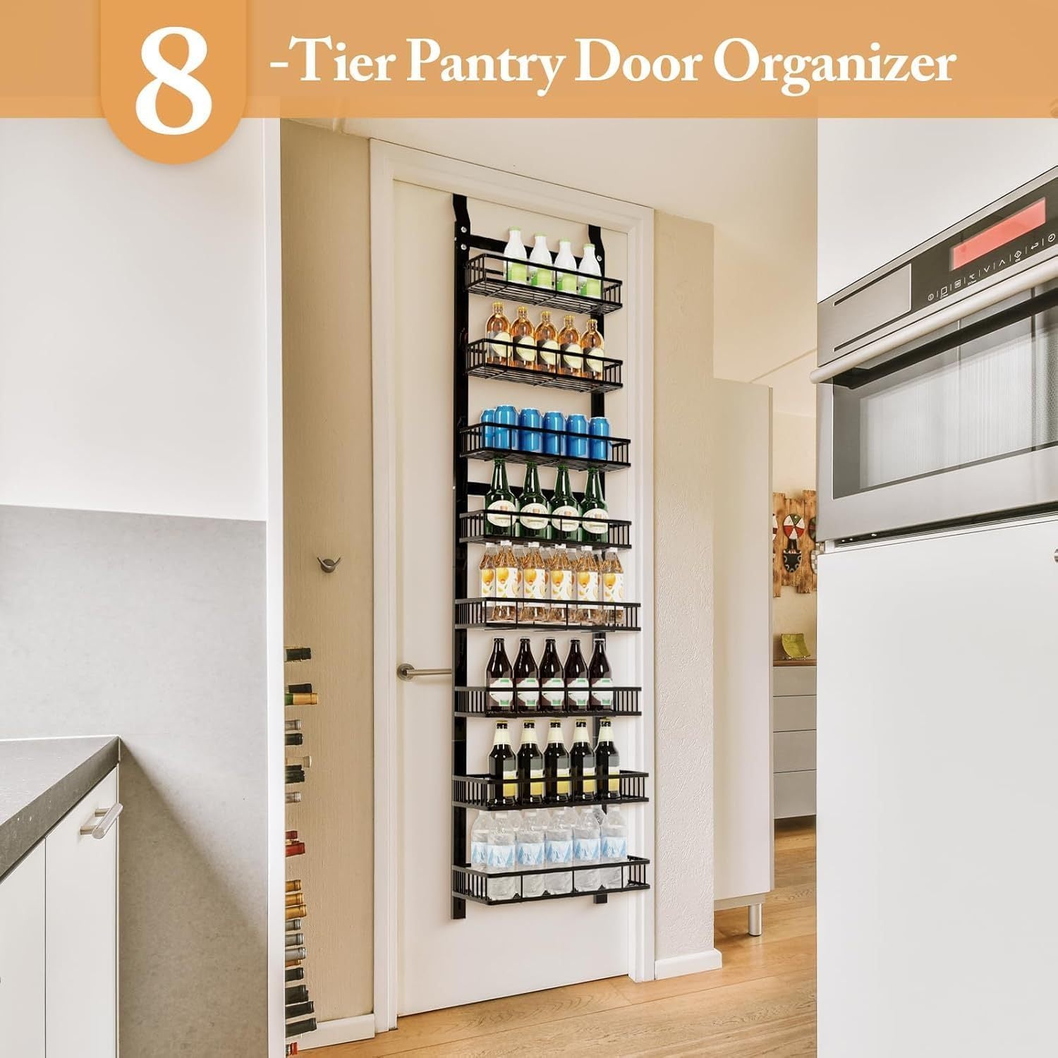 [Size]: The specification of this Pantry Door Organizer is 16.54inchx7.48inchx67.72inch, and it can be used to store cans, bottles and other items.