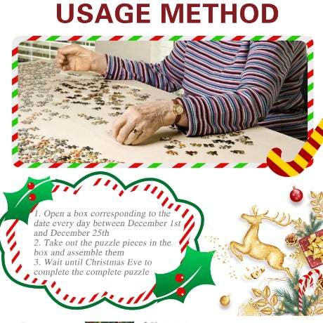 Our The Jigsaw Puzzle Advent Calendars contain high quality recyclable cardboard. It can exercise memory, improve cognitive function, deepen connections, stress relief, relieve anxiety. Its use is simple: Open a box corresponding to the date every day between December 1st and December 25th. Take out the puzzle pieces in the box and assemble them. Wait until Christmas Eve to complete the complete puzzle. Improve children's manual and mental abilities and bring happiness to children.