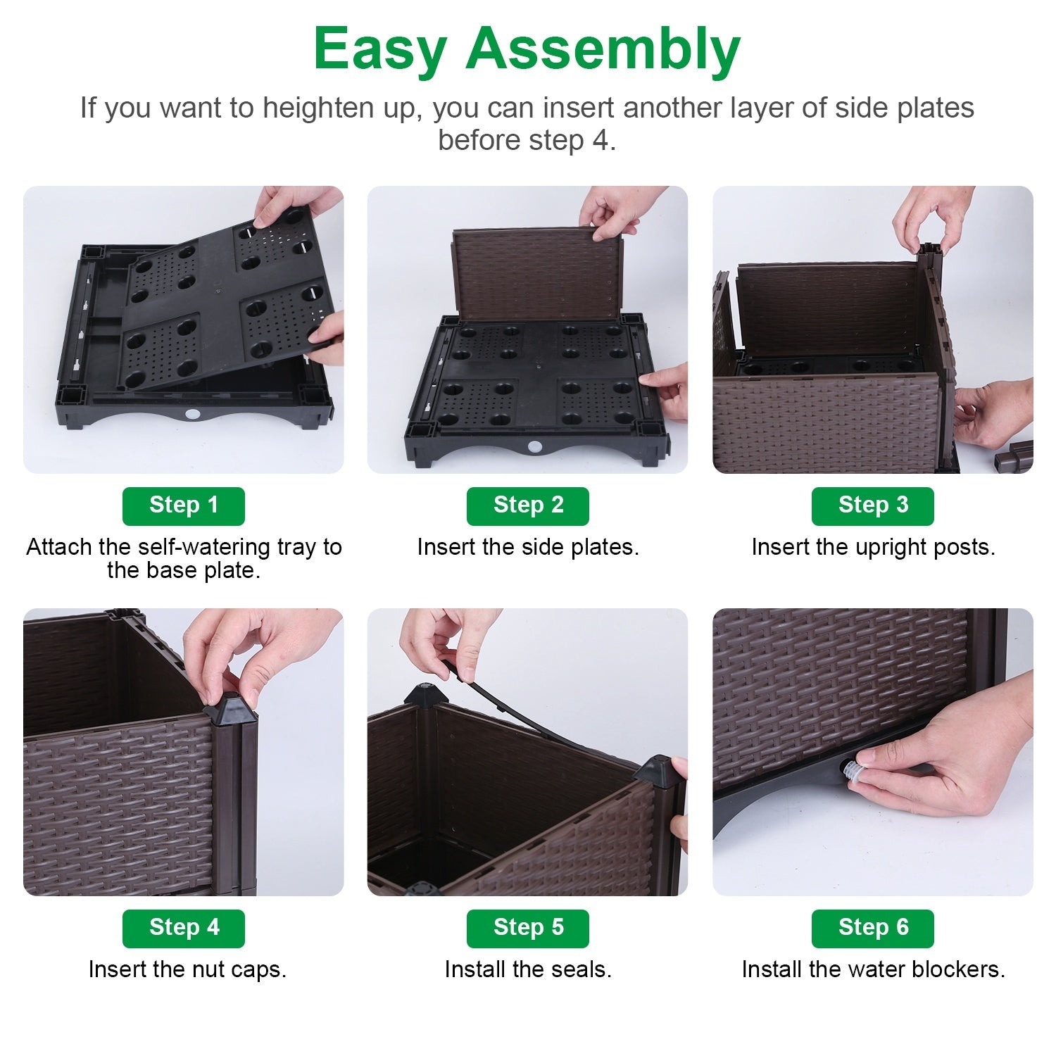- Easy Assembly: Easy to assemble. Attach the self-watering tray to the base plate, install the side plates, insert the upright posts, then install the nut caps and water blockers.
