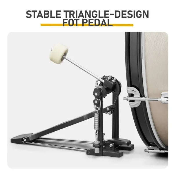 Full Size Adult Drum Set 5-Piece Silver including a 22" x 16" bass drum, 16" x 16" floor tom, 13" x 11" and 12" x 10" tom drum, 14" x 5.5" snare drum, 14" hi-hat cymbals, 16" crash/ride cymbal, all stands, stool, drumsticks, hardware, chain-driven pedals, and drum adjustment key. Perfect for all adult musicians, beginner to advanced, this full-size set provides everything needed for playing and perfecting practice. This drum kit is updated with a double-layer oil drum skin.So our drum has higher hardness and toughness than the single-layer oil skin drum of market. It is more resistant to puncture, more resistant to friction, can withstand high temperature and low temperature.