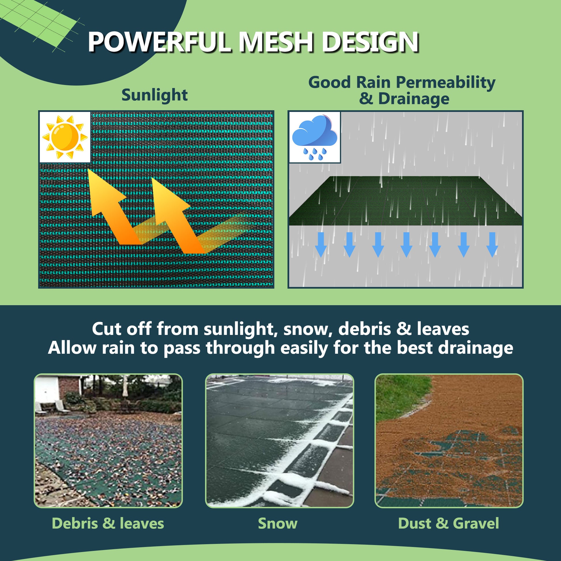 · Keep Pool Clean: The pool cover allows water to pass through and drain efficiently while blocking leaves, snow, and debris, leaving the pool tidy for the next spring and keeping it in pristine condition for spring and summer.