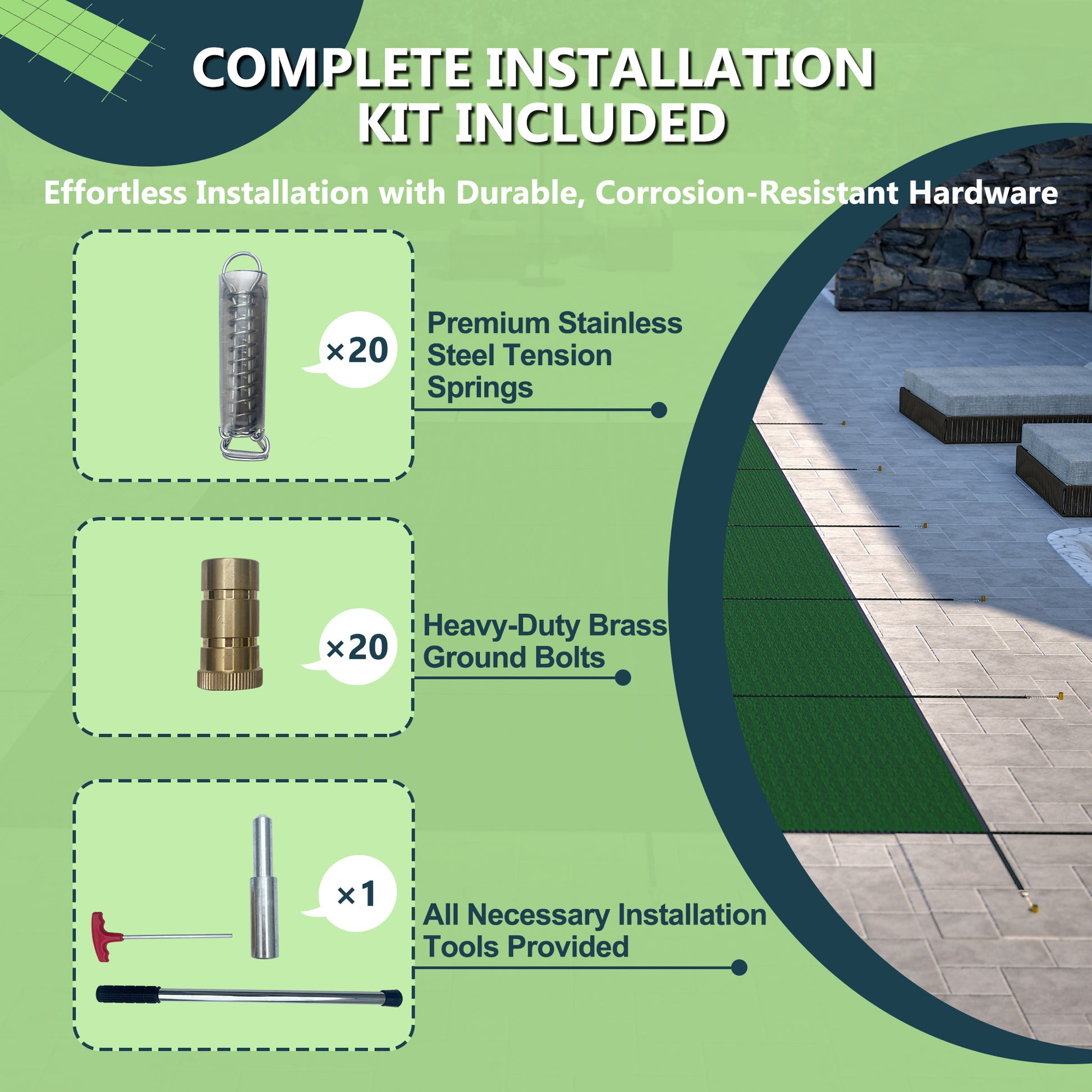 · Children & Pets Care:The solid tensile design of the pool cover effectively prevents children and household pets from accidental drowning. Additionally, it helps reduce water evaporation and keeps the pool water clean during winter.