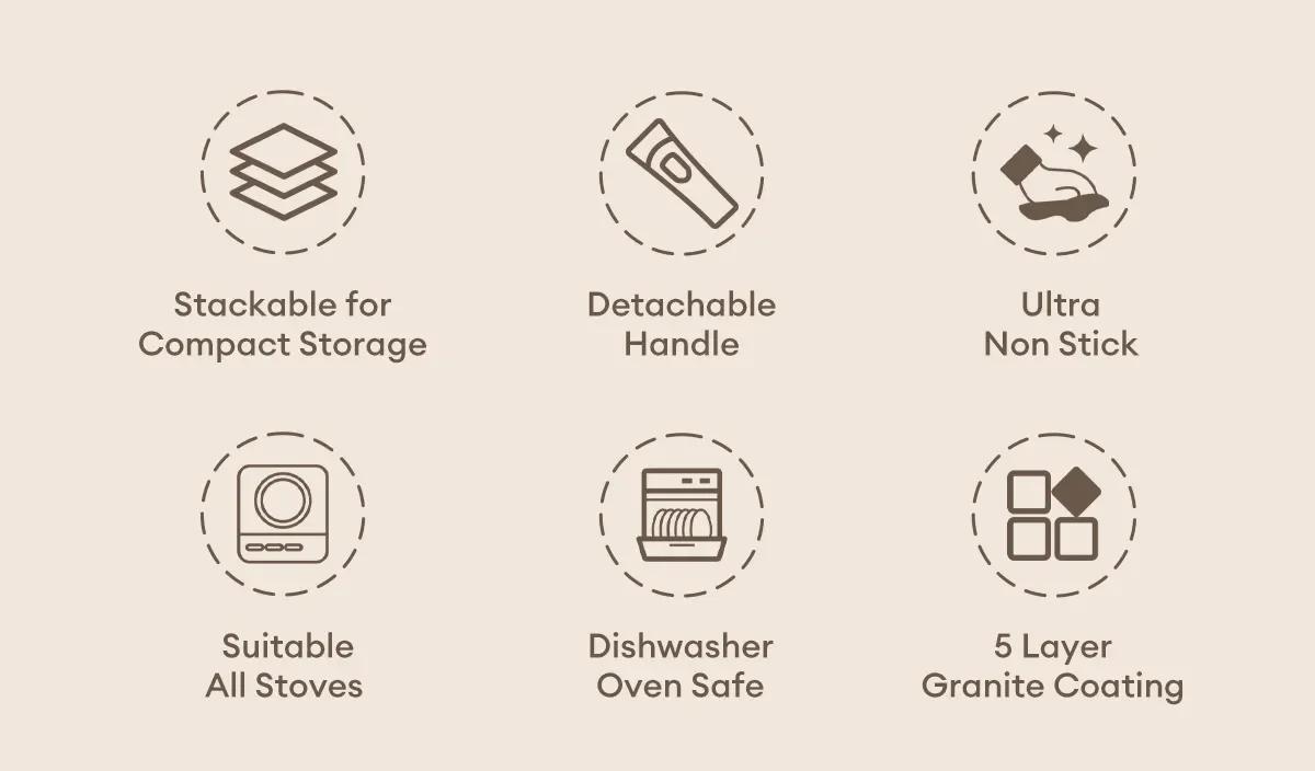 - Easy Storage: The removable handle pan set can be easily stacked in a corner of the cabinet after use, saving up to 80% of space compared to traditional pans