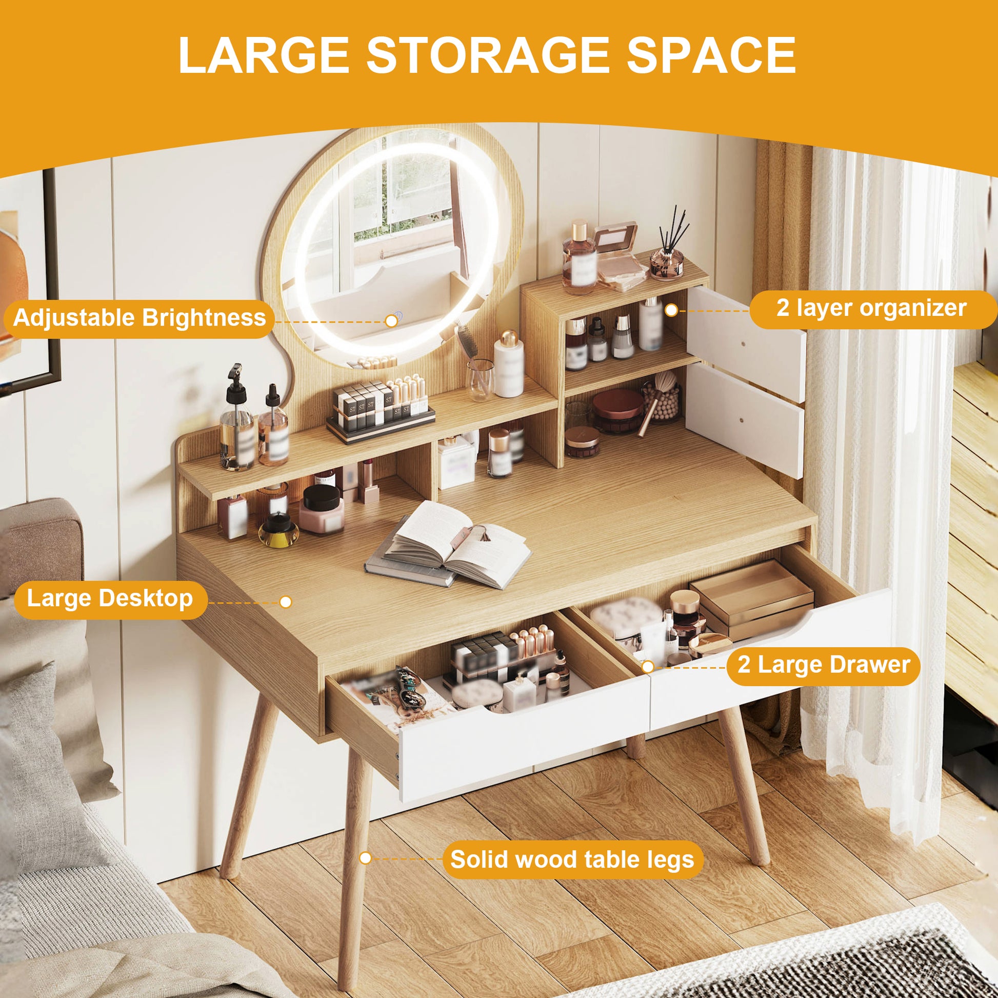 - VANITY WITH STORAGE: Make your room look very neat and elegant. This vanity desk with mirror and lights has a wide table top and 3 open shelves, 4 drawers. You are able to easily find your cosmetics, jewelry and other beauty supplies