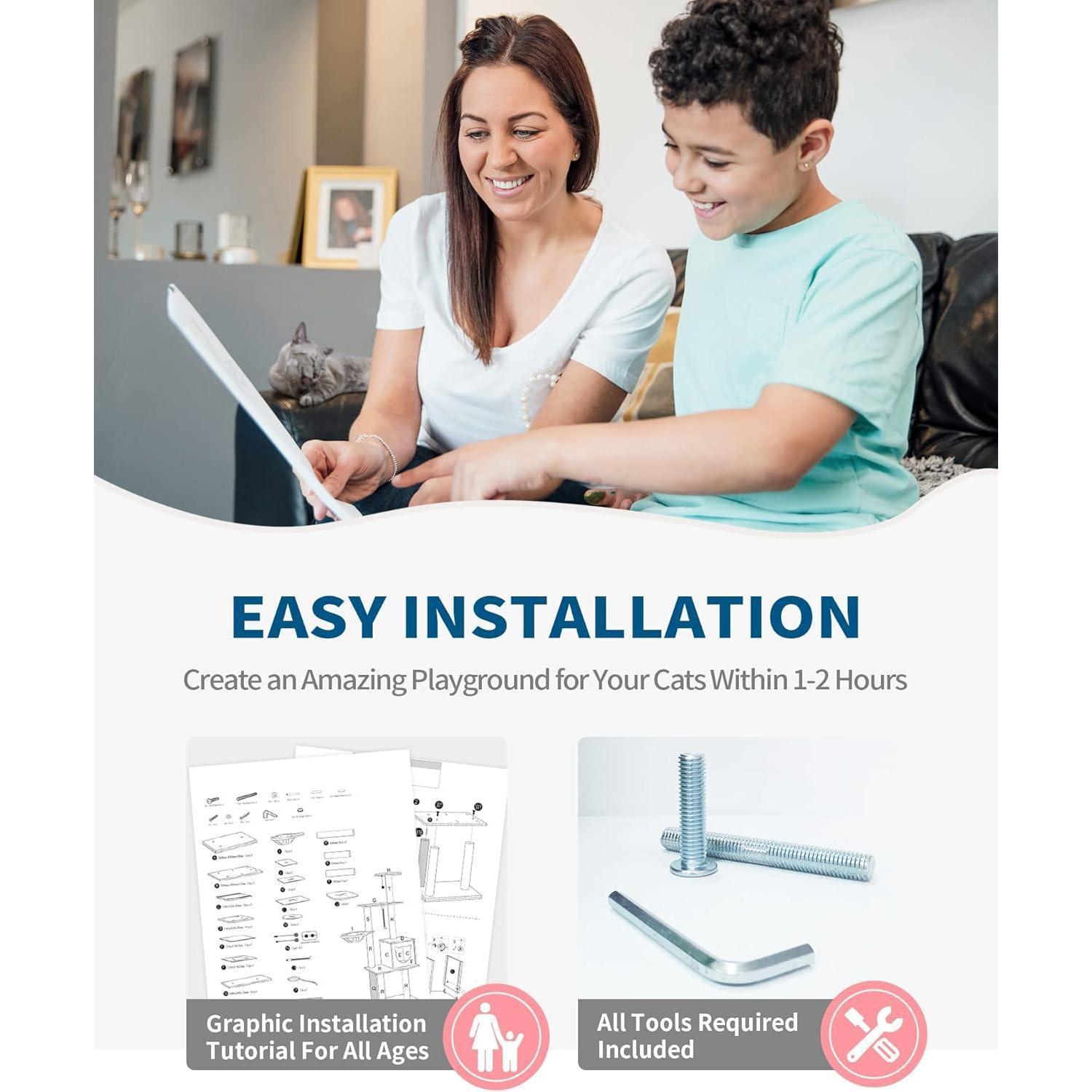 Simple to Assemble: The instruction comes with lots of images which is very easy to follow. From children to the elderly, people of all ages could easily assemble the cat furniture within one or two hours. All tools and accessories needed are given in the package. 4 foam pads could be stuck on the bottom to protect your floor from scuffing