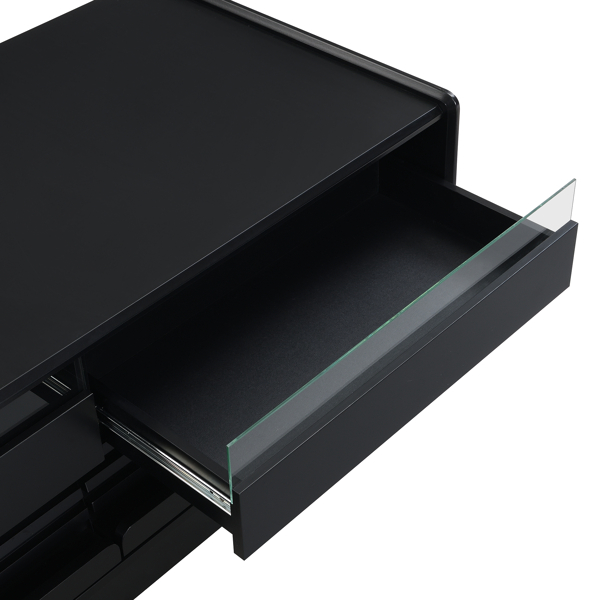 This elegant vintage-inspired rectangular coffee table is the perfect blend of aesthetics and functionality. With its ample storage space, stylish design, and high-quality materials, it offers a timeless charm that will complement any interior. The four drawers, glass accents, and grooved details create a harmonious balance between vintage and modern design elements, making it a standout piece in any room.Investing in this coffee table means bringing both beauty and practicality into your home. Whether you place it in your living room, bedroom, or dining area, it promises to not only elevate your decor but also provide a functional solution for organizing your space. This coffee table will undoubtedly become a beloved focal point in your home for years to come.