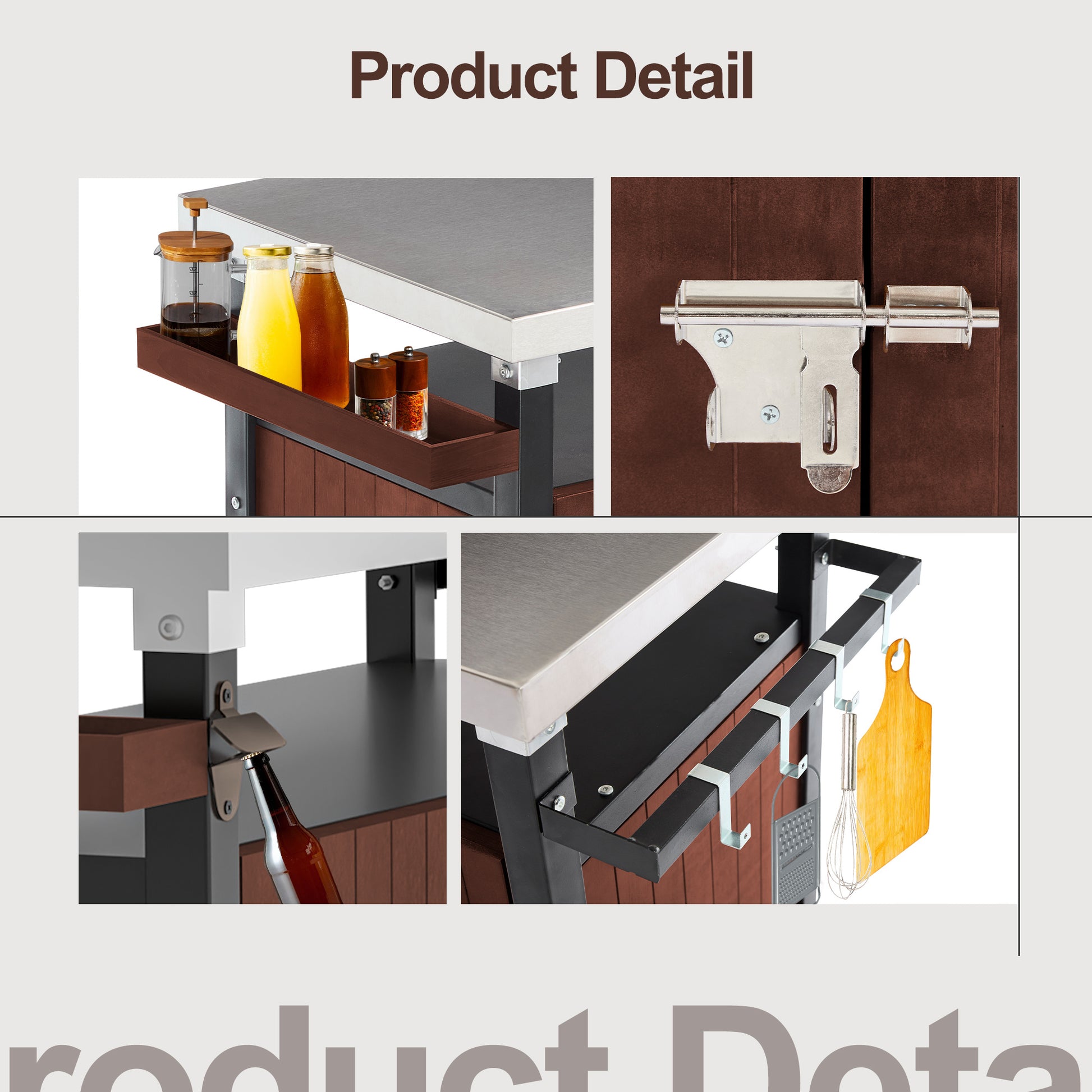 - 【Superior Construction】 Crafted with a robust metal frame and a sleek stainless steel top, this outdoor prep table is designed for both durability and ease of maintenance. It includes 4 handy S-shaped hooks, spacious racks for spices and towels, a designated gas line hole, and built-in bottle openers, ensuring you have everything you need for efficient food prep during your party carnivals.
