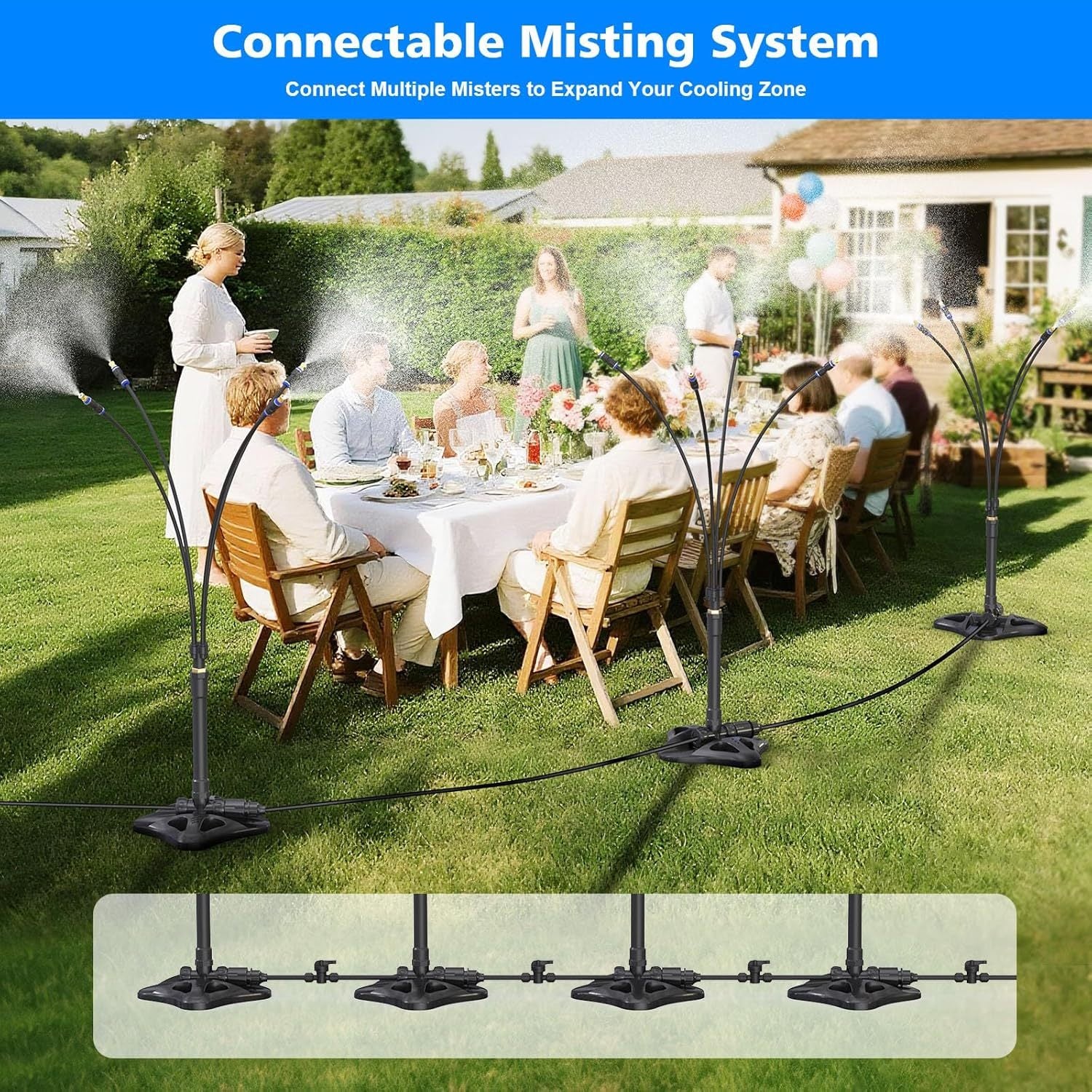 - ⛱️【Fast Installation Anywhere】: Just connect the patio mister and enjoy! Weighted wide base stabilizes on concrete, decks, or grass without tools. 26.2ft misting hose with valve reaches from backyard faucets to patio dining areas.
