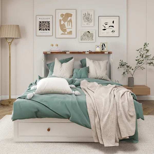 Queen Size Murphy Bed Frame With Drawers Murphy Chest Bed With Charging Station, 2 USB Ports Mobile Murphy Bed Sleeping Arrangement For Multipurpose Area For Bedroom Living Room Guest Room White&Wood