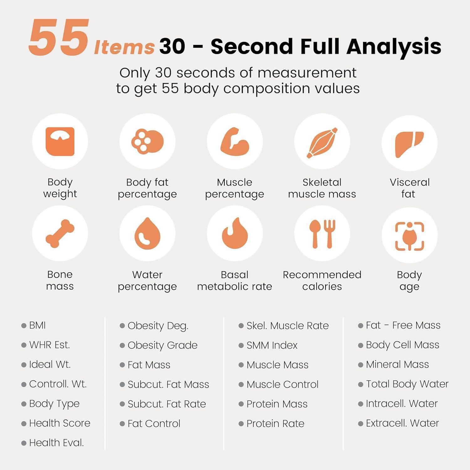 『55 Body Metrics Lightning-fast Data Transfer & Seamless Compatibility』With an impressive Bluetooth speed of 2 Mbps, the FitSpec bodyfat measuring device can perform a full 55-point body metrics analysis in just a few seconds. Effortlessly sync your results with popular health and fitness APPs such as APPle Health and Samsung Health. Plus, enjoy hassle-free connectivity with a wide range of devices, including iPhones, Apple Watches and Android gadgets with the FitSpec smart body scale.