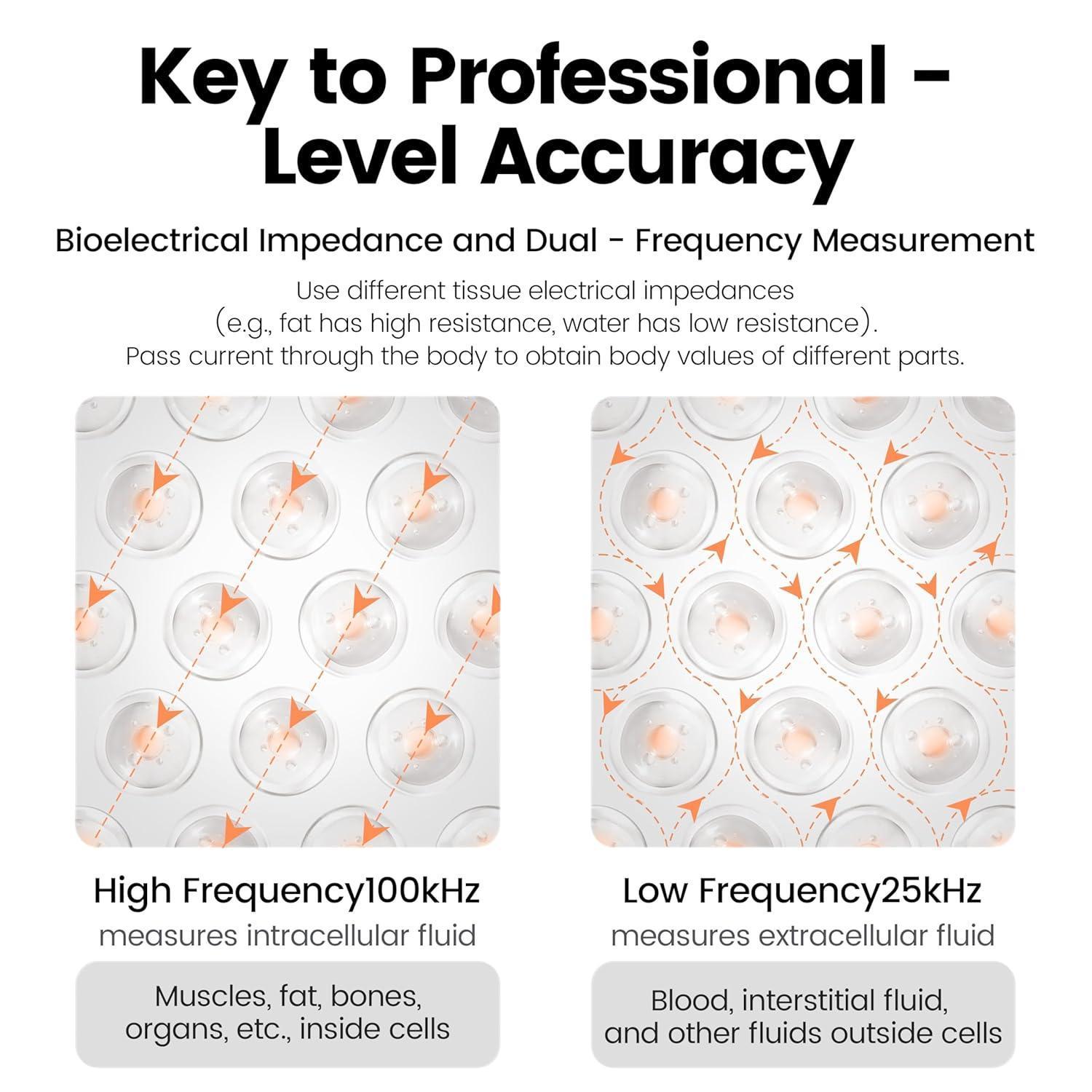 Over 96% Accuracy Compared to the Professional』Featuring a high-precision chip and ultra-sensitive sensor, the FitSpec bodyweight scale utilizes 100 kHz & 25 kHz dual-frequency micro-current technology to deliver precise whole body measurements of muscle, fat, bone density composition and much more. The FitSpec accurate scale achieving up to 96% of the accuracy of professional equipment, the FitSpec body fat monitors empowers users to effortlessly track their physical health data.