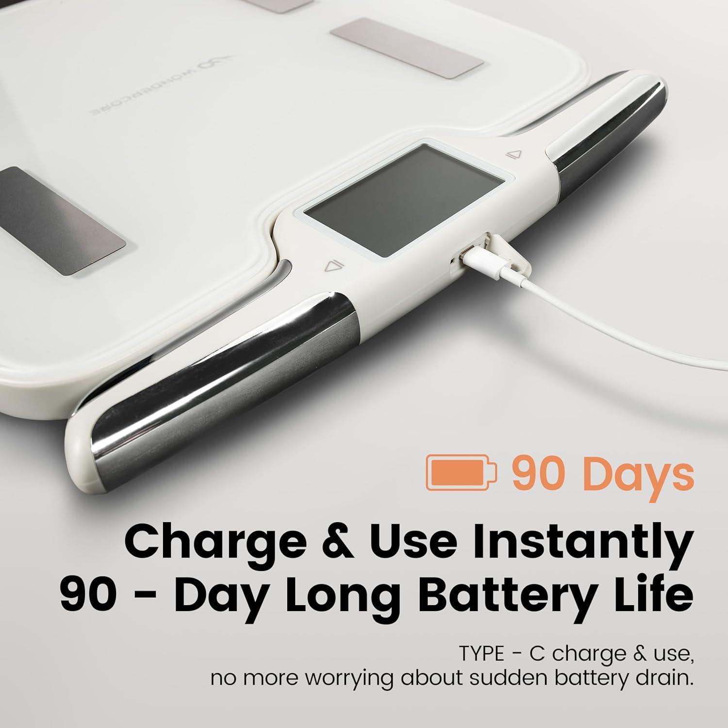 『One Charge Lasts for Over 90 Days of Use』With an integrated 800 mAh battery and a convenient Type-C charging port, the FitSpec body weight scale boasts an impressive battery life of over 90 days with just 2–2.5 hours of charging. Enjoy uninterrupted tracking of your body metrics without the hassle of frequent battery replacements. Effortlessly stay connected to your health goals with the FitSpec digital scales for body weight.